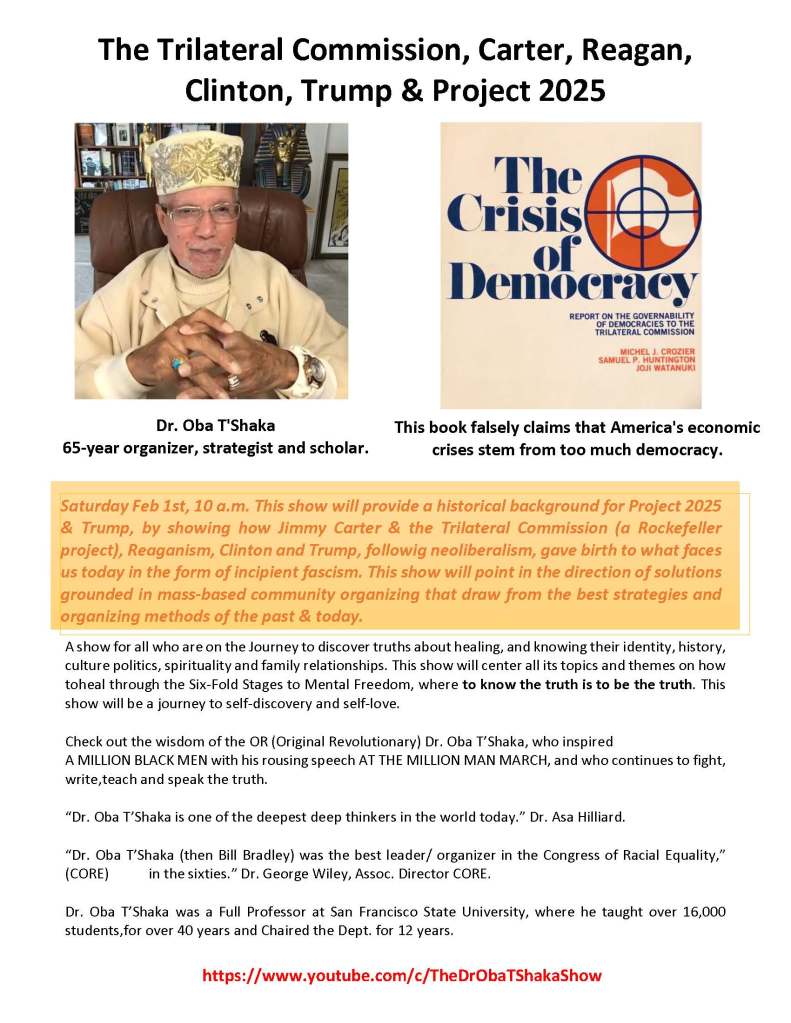 ORIGINAL YOUTUBE DESCRIPTION: This show will provide a historical background for Project 2025 & Trump, by showing how Jimmy Carter & the Trilateral Commission (a Rockefeller project), Reaganism, Clinton and Trump, following neoliberalism, gave birth to what faces us today in the form of incipient fascism. This show will point in the direction of solutions grounded in mass-based community organizing that draw from the best strategies and organizing methods of the past & today.