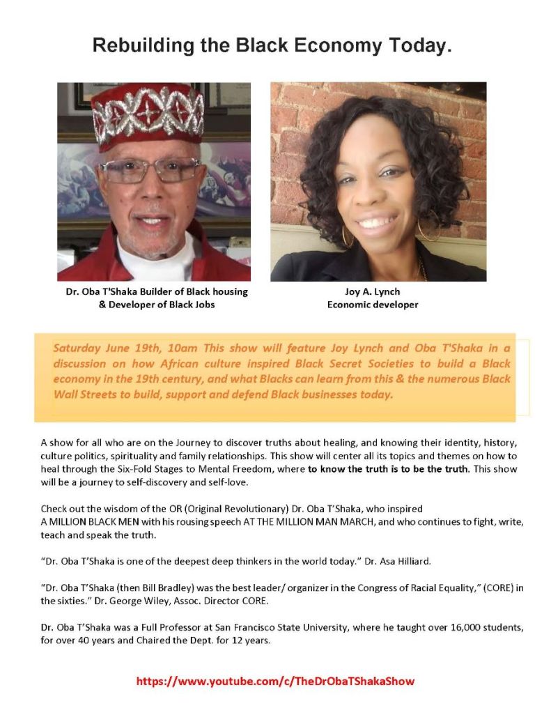 ORIGINAL YOUTUBE DESCRIPTION: This show will feature Joy Lynch and Oba T’Shaka in a discussion on how African culture inspired Black Secret Societies to build a Black economy in the 19th century, and what Blacks can learn from this & the numerous Black Wall Streets to build, support and defend Black businesses today.